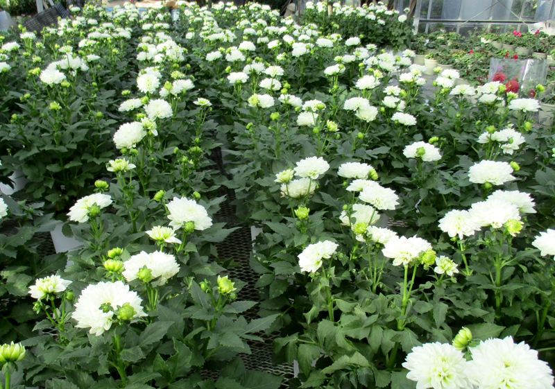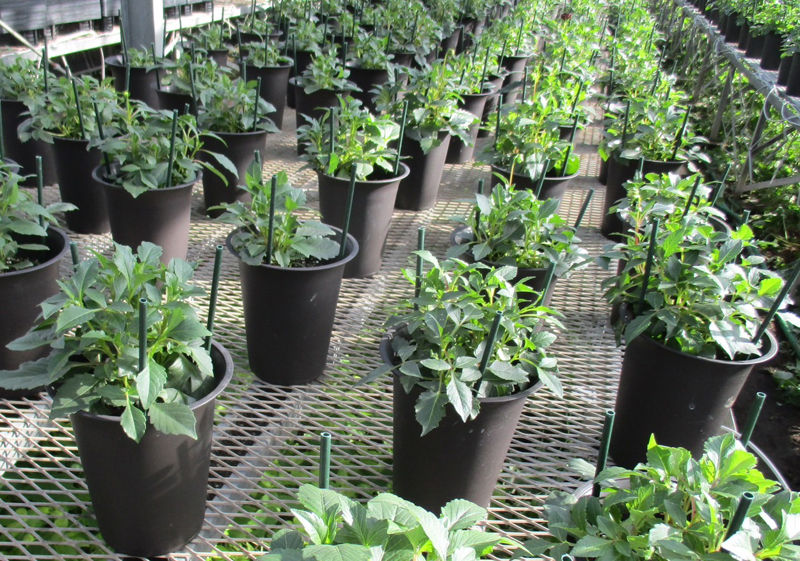 ダリアは球根植物ですが、鉢花は主に挿し木によって苗をつくって生産しています。春に出荷するものは1月~3月に、秋に出荷するものは6月頃に挿し木と定植を行います。摘心をして枝の数、花の数を増やし、株にボリュームをつけています。