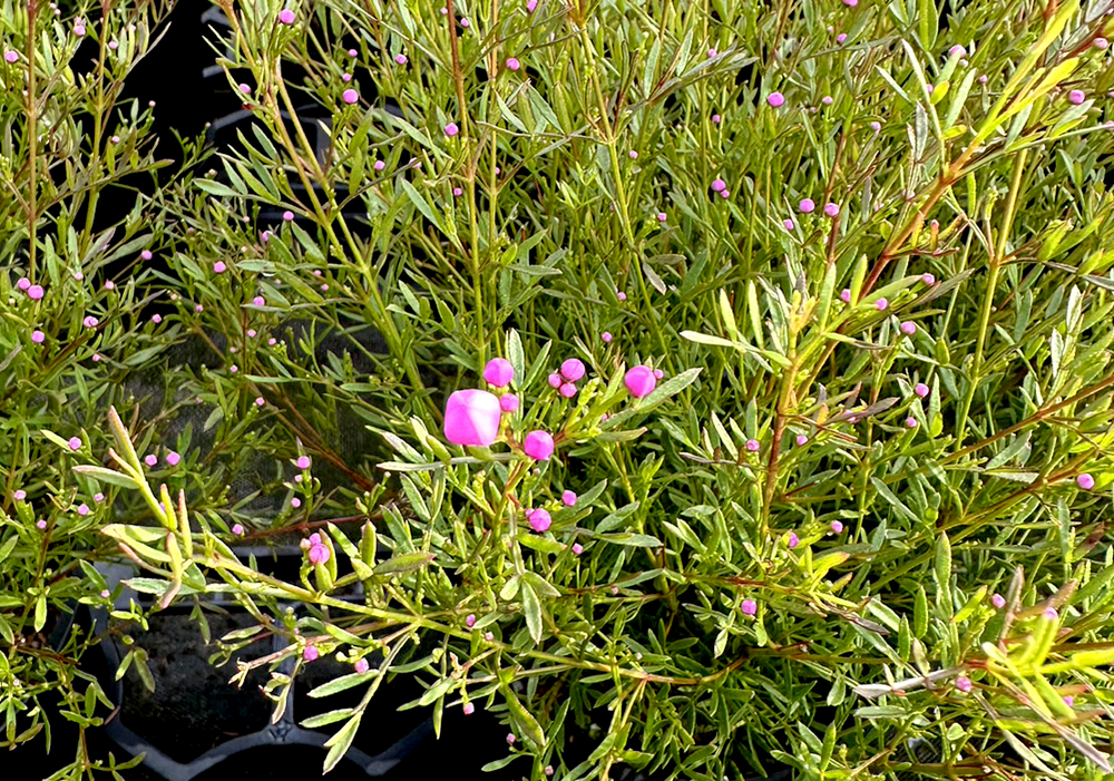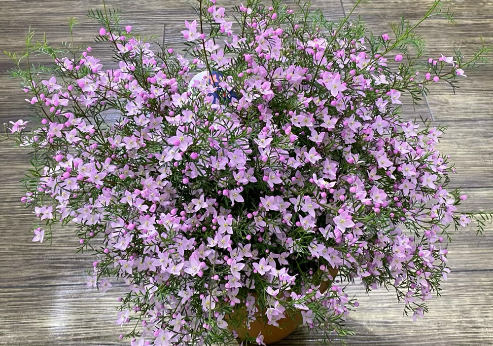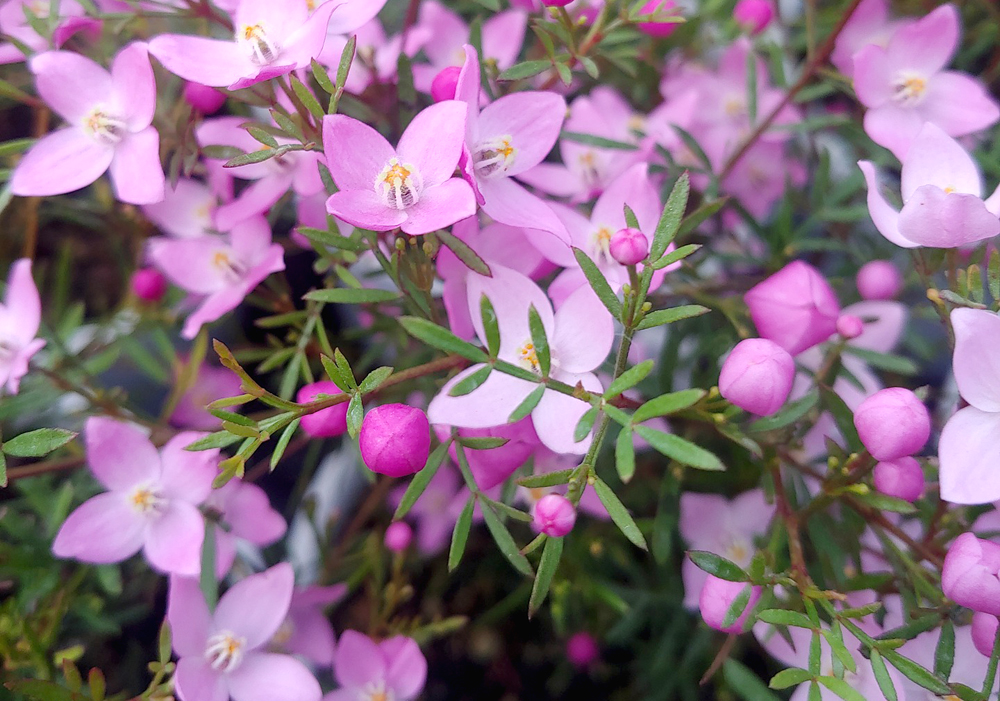 ボロニア・ピナータは南西部のニューサウスウェールズ地方に分布しています。日本と比べて夏は涼しく、冬は暖かいというマイルドな気候の土地です。自生地では150㎝ほどの低木になります。ミカン科の植物なので、葉に触ると柑橘系のとても良い香りがします。