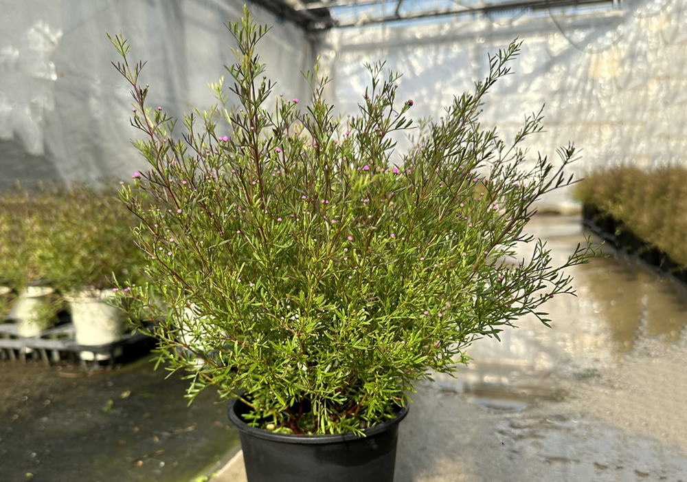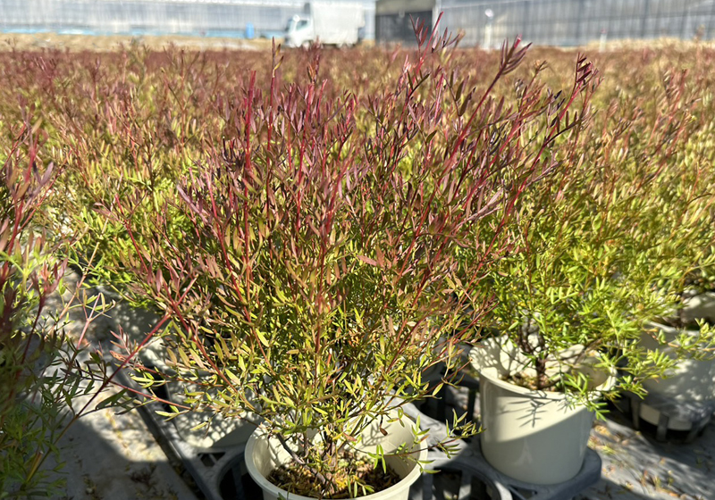 オーストラリア生まれのボロニア・ピナータは高温多湿である日本の夏は苦手なので、夏から秋は涼しい露地で栽培します。株の養成に1年、樹形を整えて花を咲かせるのにもう1年と、挿し木をしてから出荷するまで、約2年かけて大切に育てます。