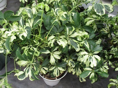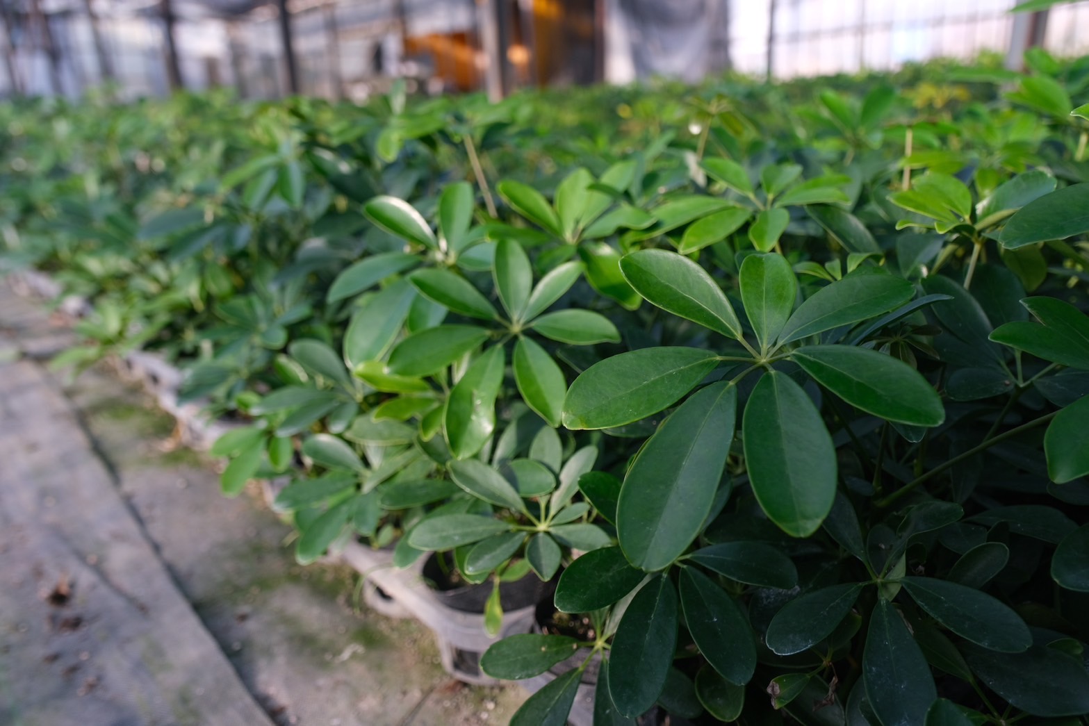 シェフレラの生産は、12~1月に親株から枝を採り、挿し木をします。挿し木で発根した苗は5月頃にポットに植えられ、十分育った苗は9月頃から出荷用の鉢に植え替えられて冬から出荷されます。