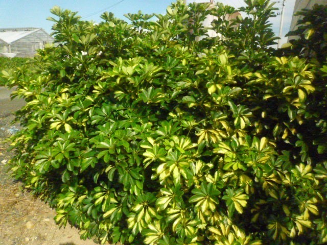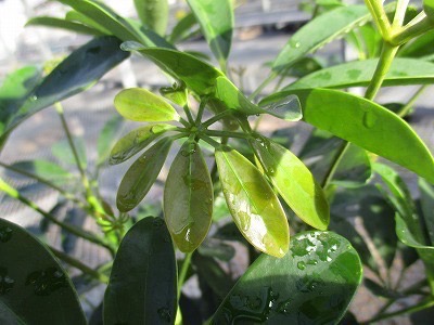 シェフレラ‘ホンコン’は「ホンコンカポック」とか単に「ホンコン」、「カポック」などいろいろな名で呼ばれます。カポックというのはパンヤ科の別の植物の名称ですが、葉の形がよく似ており「ホンコンから来たカポックのような木」であることからこう呼ばれるようになったようです。